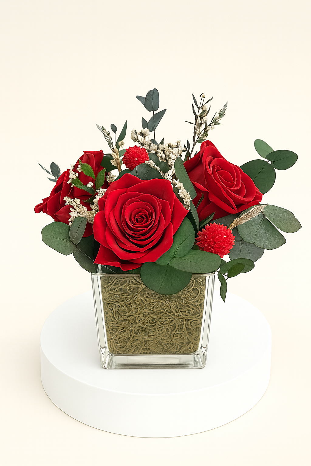 Florero en cristal transparente con 3 rosas Premium y follaje variado